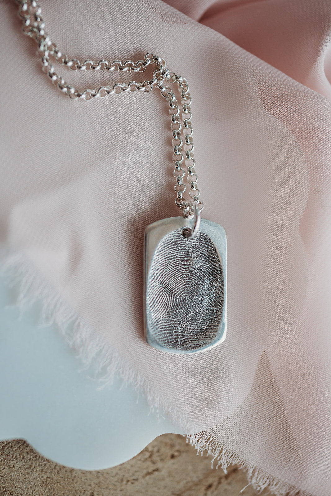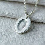 Showcase your unique fingerprint jewellery in style, with your love one's actual fingerprint captured in sterling silver—just as meaningful for adults! Visit a local jeweller for the impression or use our moulding kit at home to create the perfect pendant. Choose from a variety of shapes, with a hand-engraved name and age included. Complete the piece with one of our Italian-made, refined sterling silver fine belcher chains, available in five sizes, and optionally add a birthstone for a personal touch.