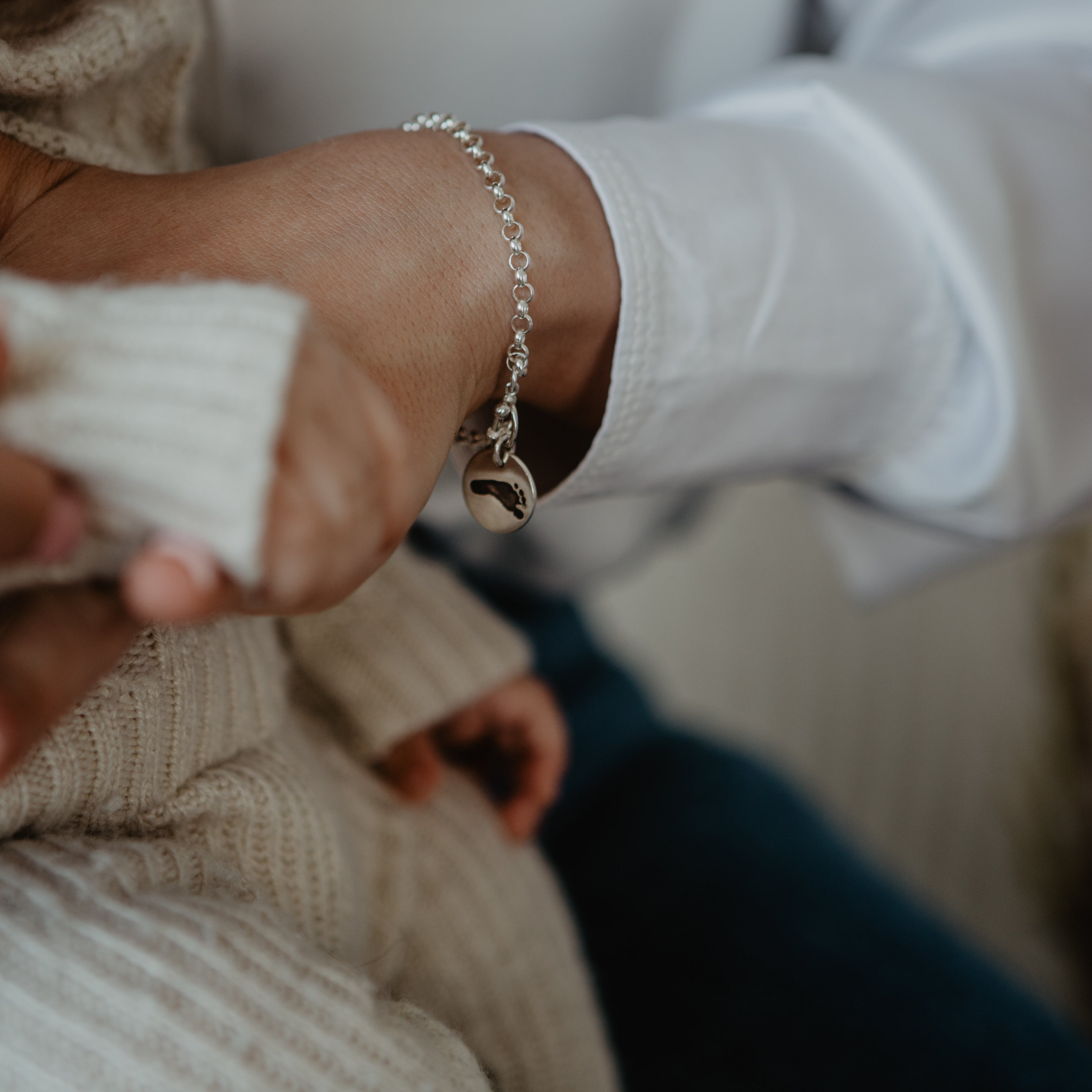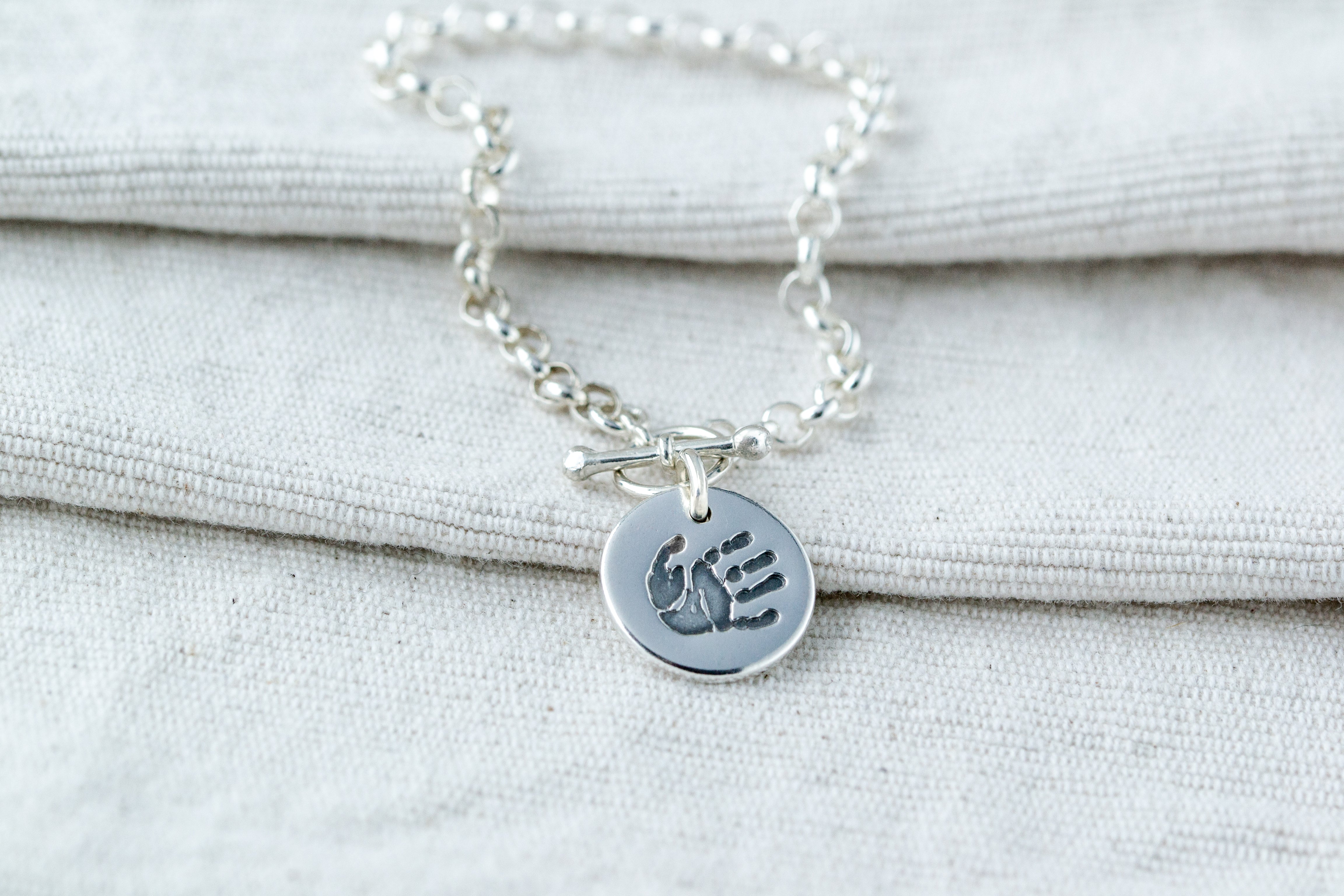 Capture handprints and footprints on a sterling silver charm and display it on a classic, delicate belcher bracelet. This hand and footprint jewellery piece attaches to the bracelet with a sterling silver carrier. If you already have a print or clay cast, simply upload it with your order. If not, add one of our hand & footprint kits to create a new print. Charms come in a variety of shapes, and we can engrave a name and age on the back—all included in the price!