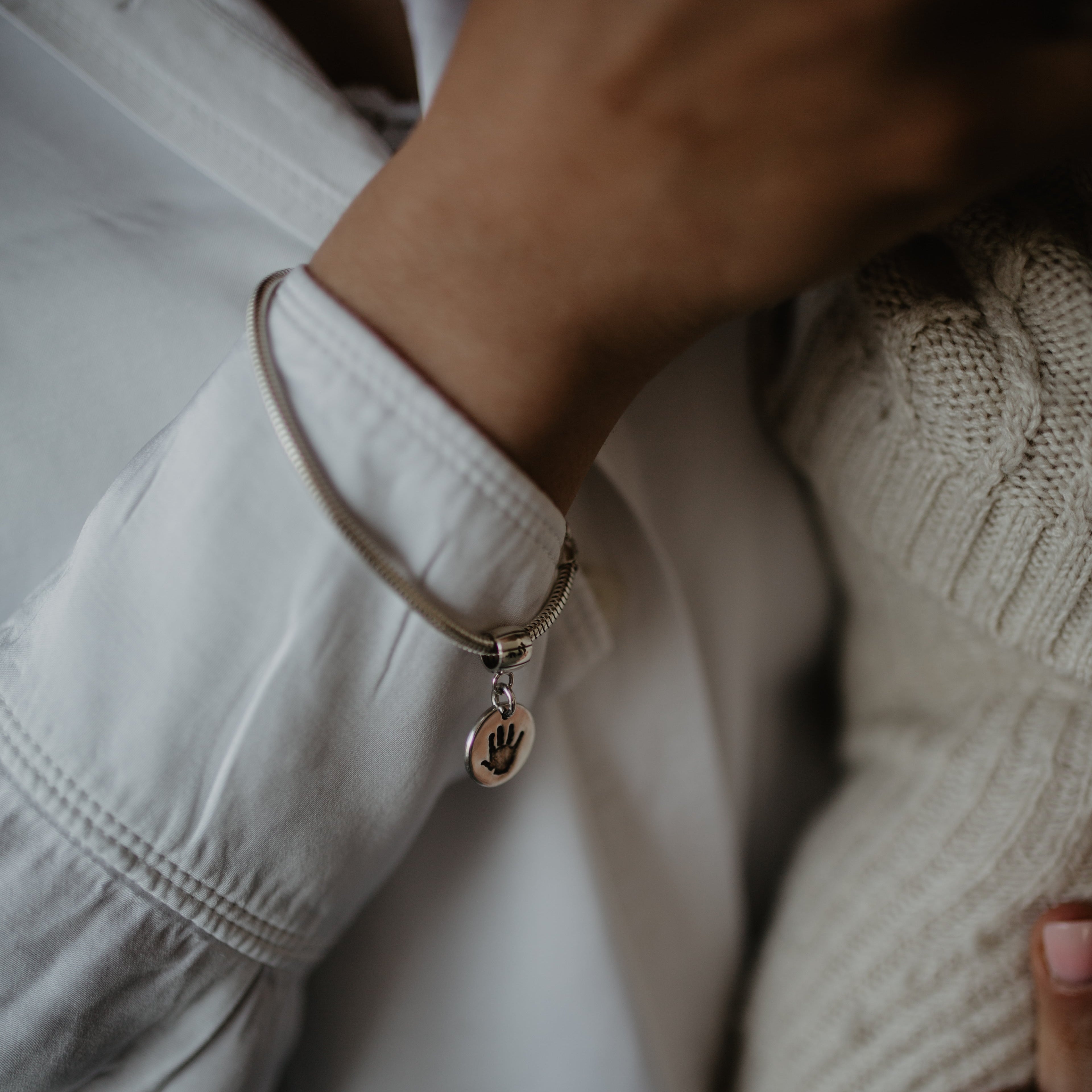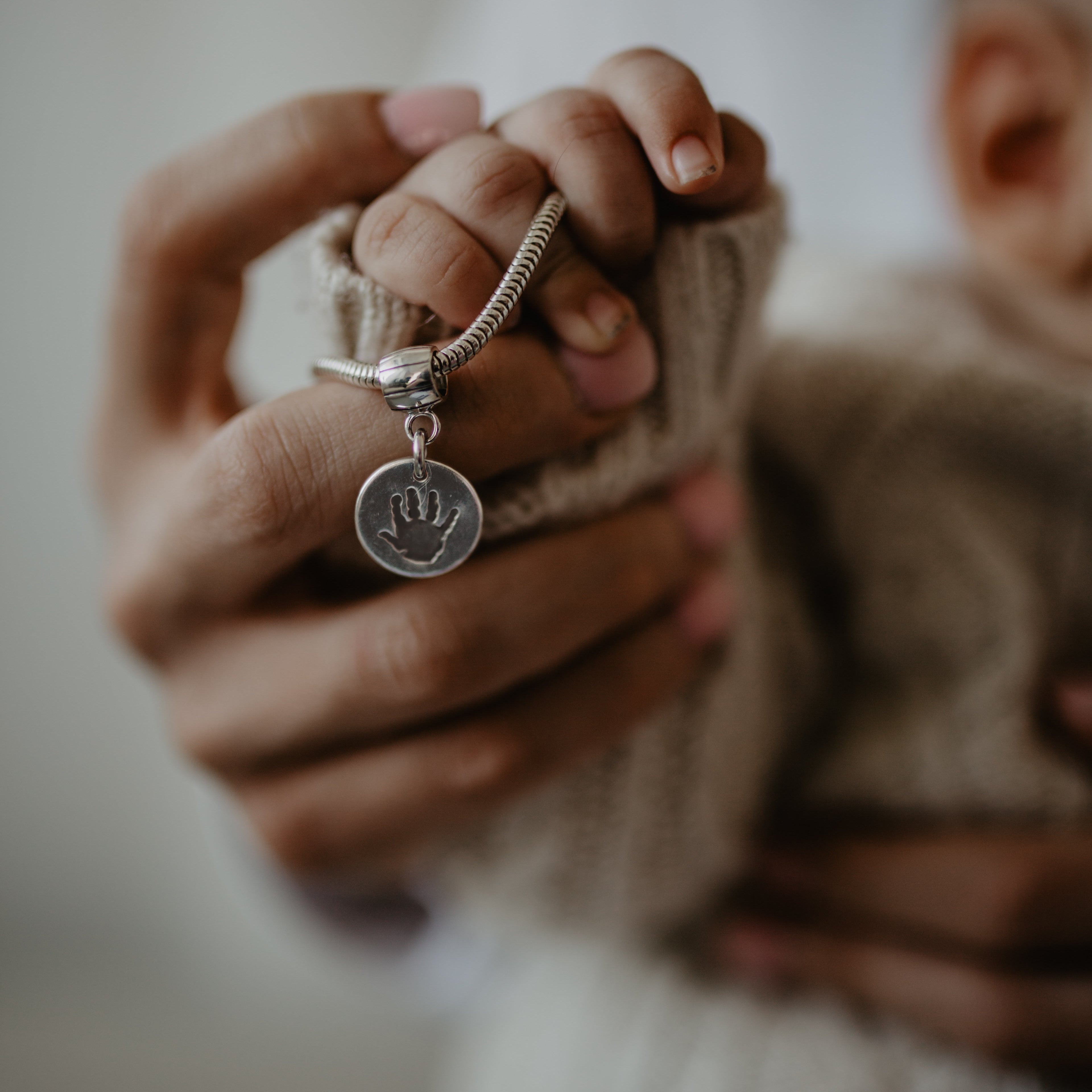 Capture handprints and footprints on a sterling silver charm and showcase it on a silky snake chain bracelet. This hand and footprint jewellery piece attaches to the bracelet with a sterling silver carrier that is also Pandora-compatible. If you already have a print or clay cast, simply upload it with your order. If not, add one of our hand & footprint kits to create a new print. Charms come in a variety of shapes, and we can engrave a name and age on the back—yes, that’s included in the price!