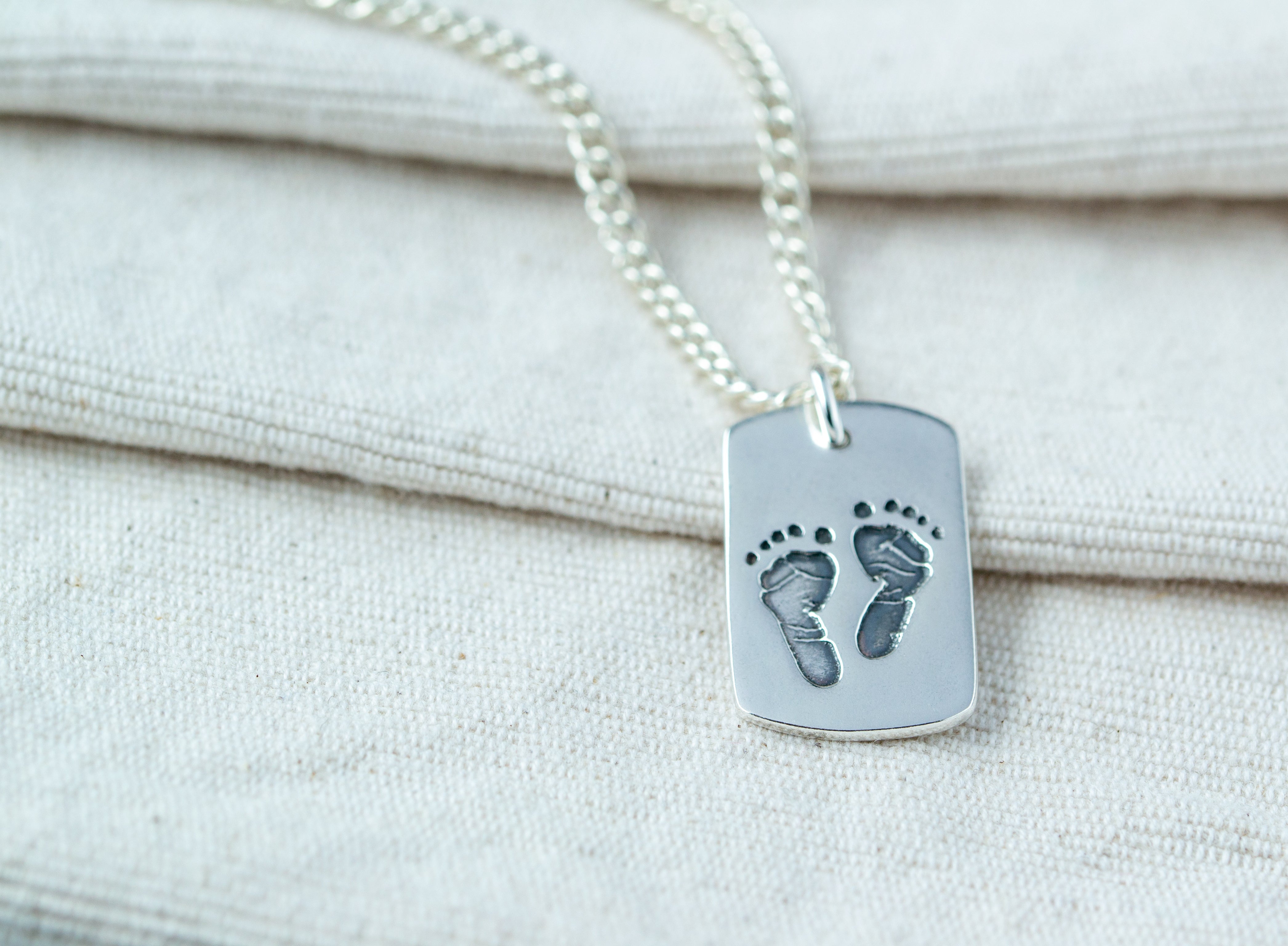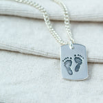 If you prefer a longer, elegant chain to showcase those tiny fingers and toes, this option is perfect for you. Capture the moment from the day your baby is born with a sterling silver pendant featuring a hand or footprint, along with a hand-engraved name and age. This pendant makes a cherished addition to any hand and footprint jewellery collection. Upload a clear photo of an existing print or clay cast, or use one of our inkless hand & footprint kits to create a new print. Choose from various pendant shapes and complete your piece with one of our Italian-made, slinky sterling silver curb chains, available in two sizes. You can also add a birthstone for a truly personalised touch.