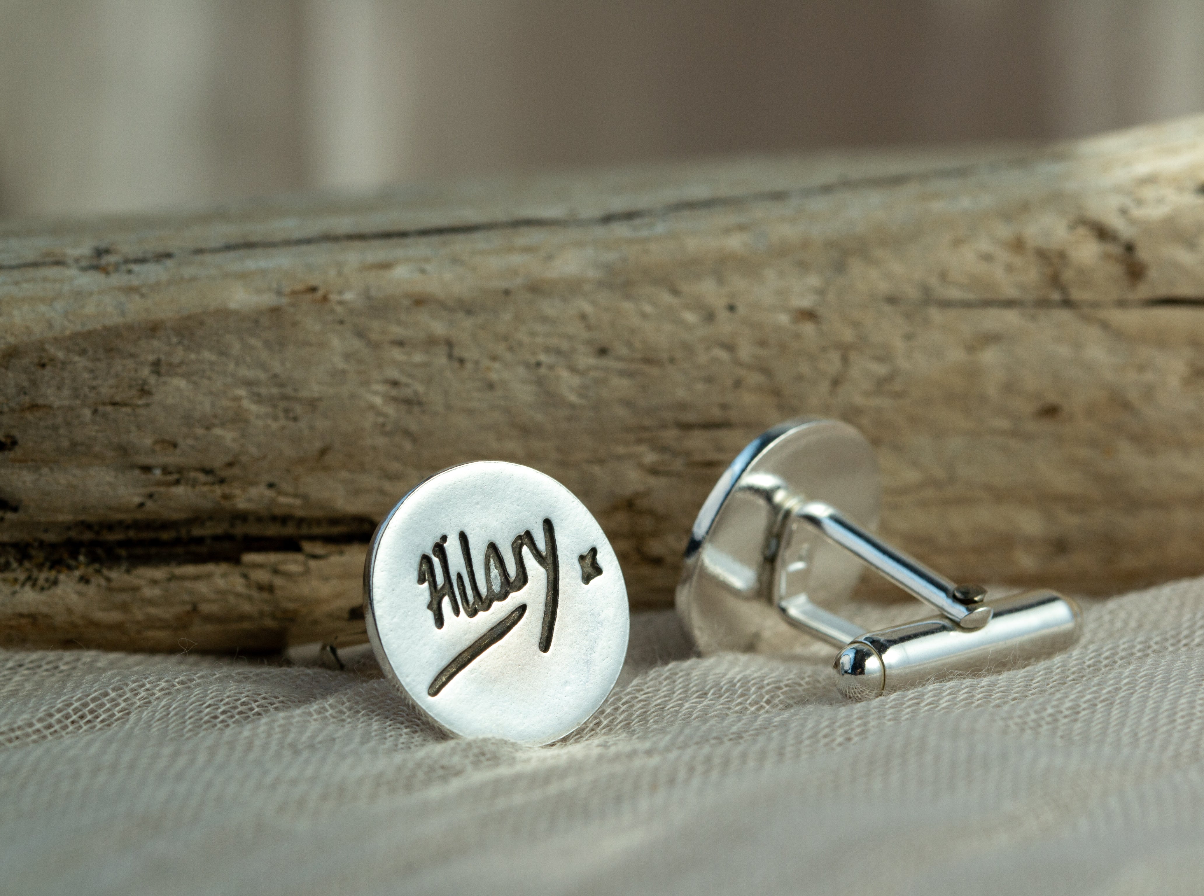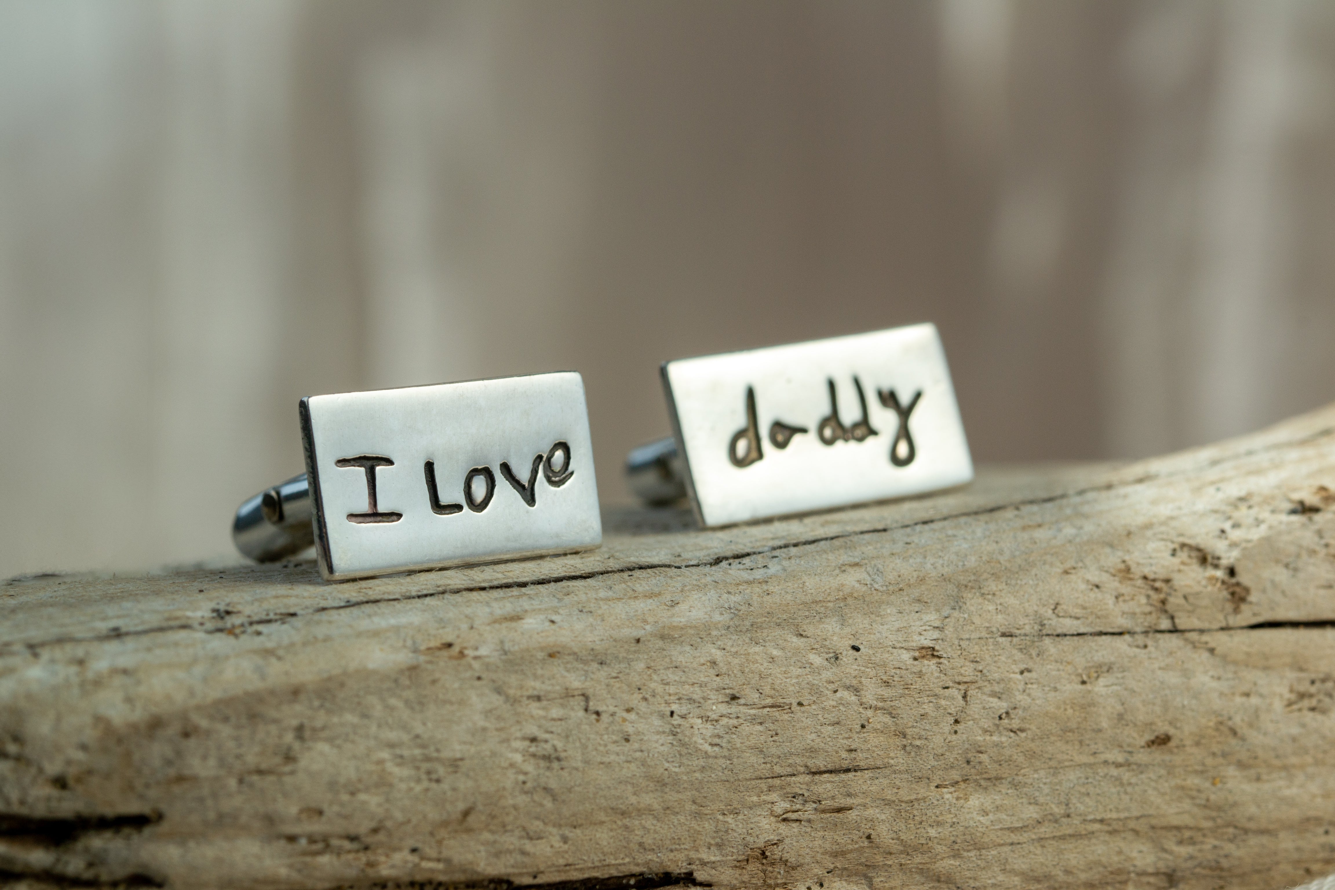 These modern sterling silver cufflink beautifully showcases handwriting jewellery, with a handwritten name or word on the front and a name engraved on the back. Whether you’re looking for a unique gift for Father’s Day, Christmas, a birthday, or any special occasion, these luxurious cufflinks make the perfect gift for him. Simply take a photo of your handwriting and upload it during the ordering process. You can’t go wrong with our discreet and elegant original handwriting cufflinks.