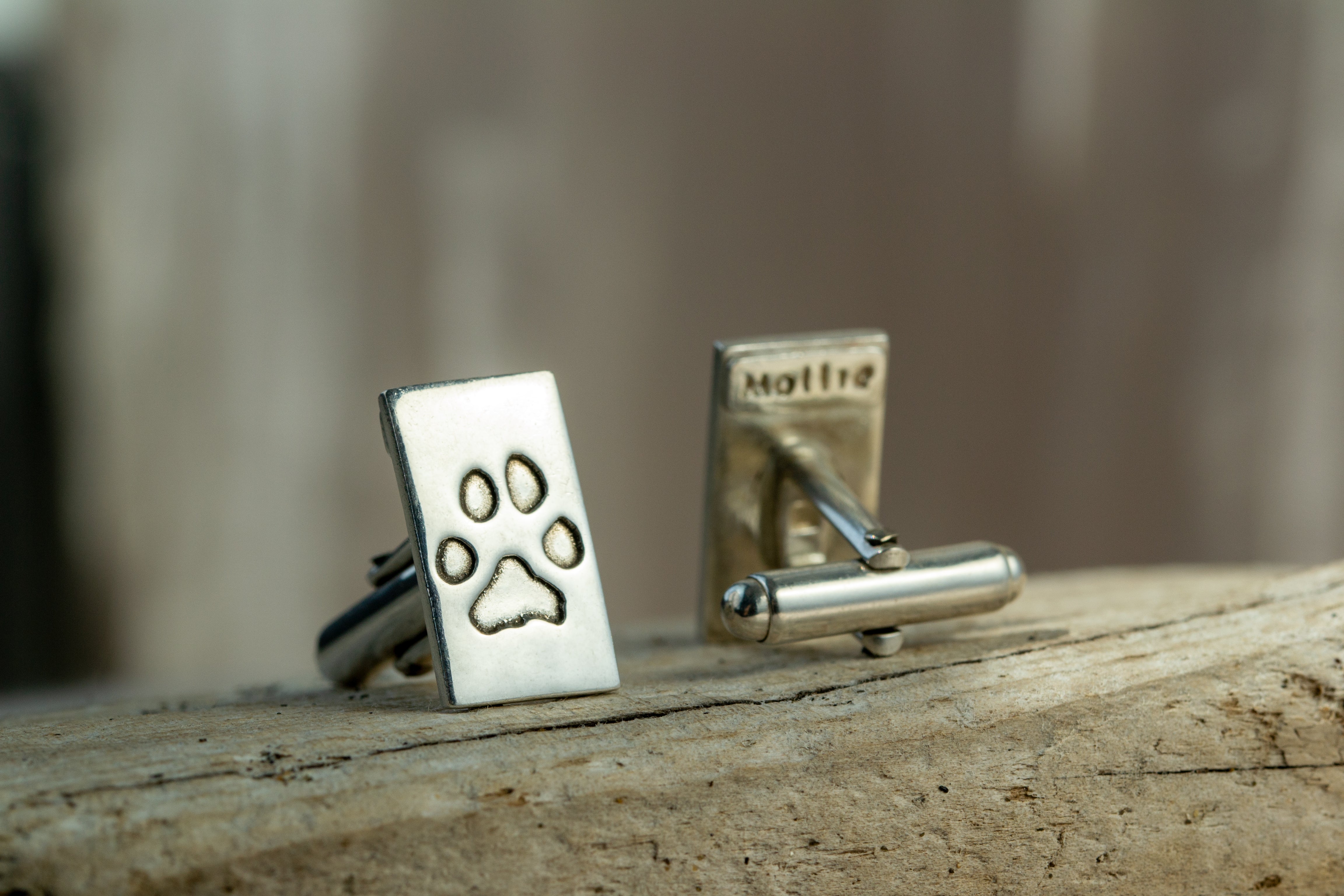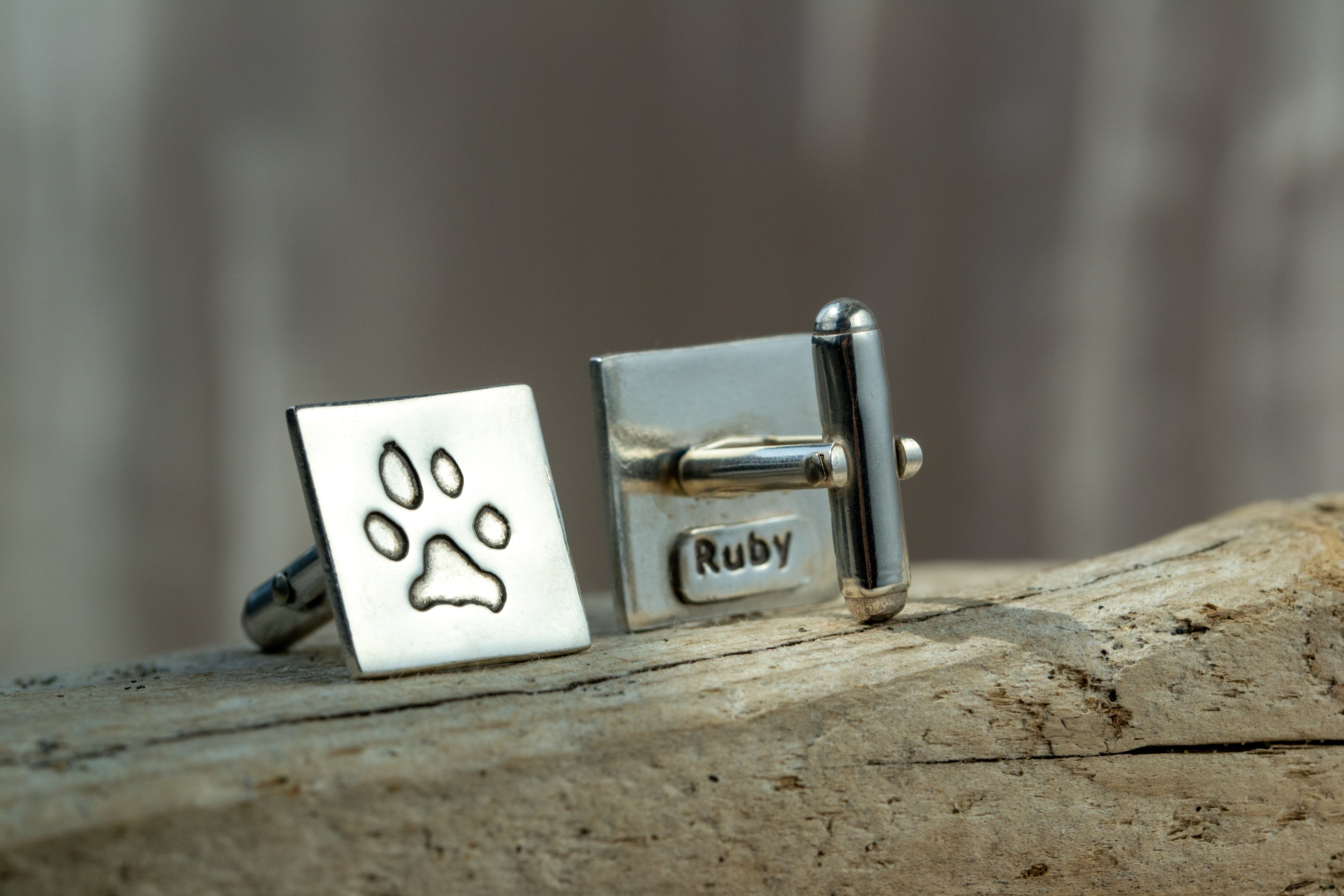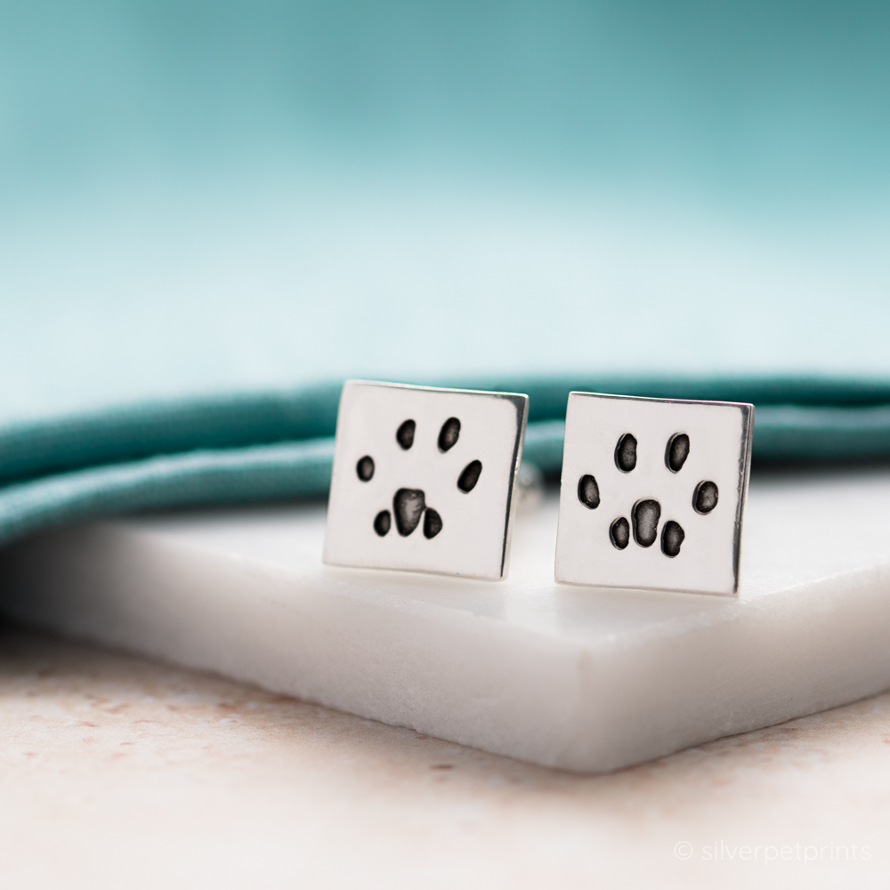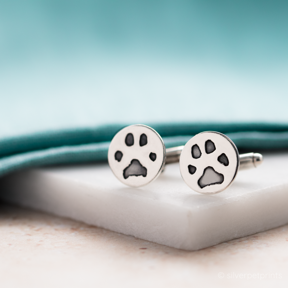 These modern sterling silver cufflinks are a stunning piece of paw print jewellery, featuring your pet's unique paw print on the front and their name engraved on the back. Whether you’re looking for a unique gift for Father’s Day, Christmas, or any special occasion, these luxurious cufflinks make the perfect choice. They also serve as an emotive memorial gift, celebrating the life and love of your beloved pet. If you have two pets, you can showcase one paw print on each cufflink, creating a truly personalised piece of paw print jewellery. You can't go wrong with our discreet and elegant paw print cufflinks.