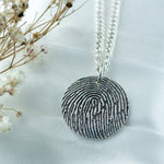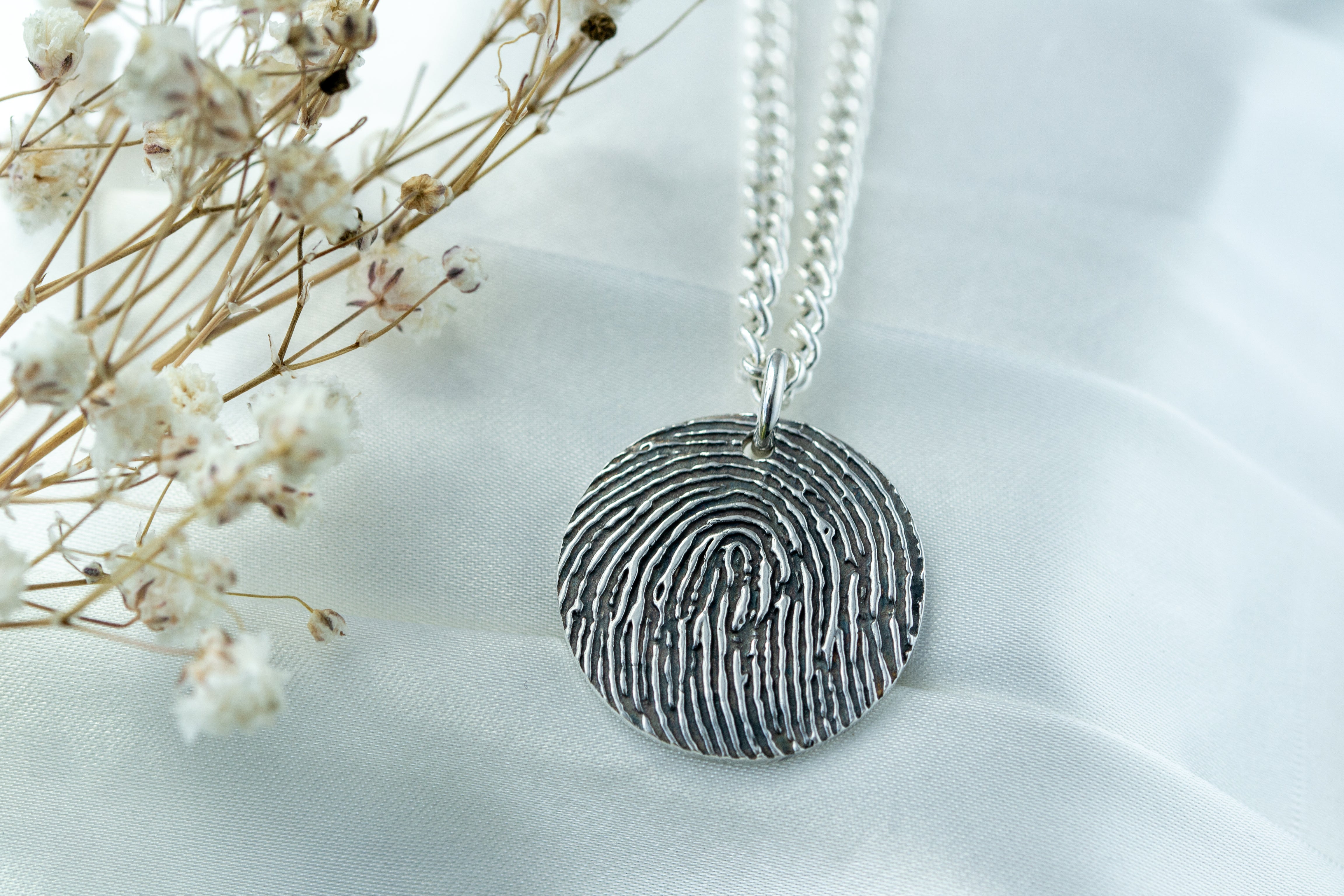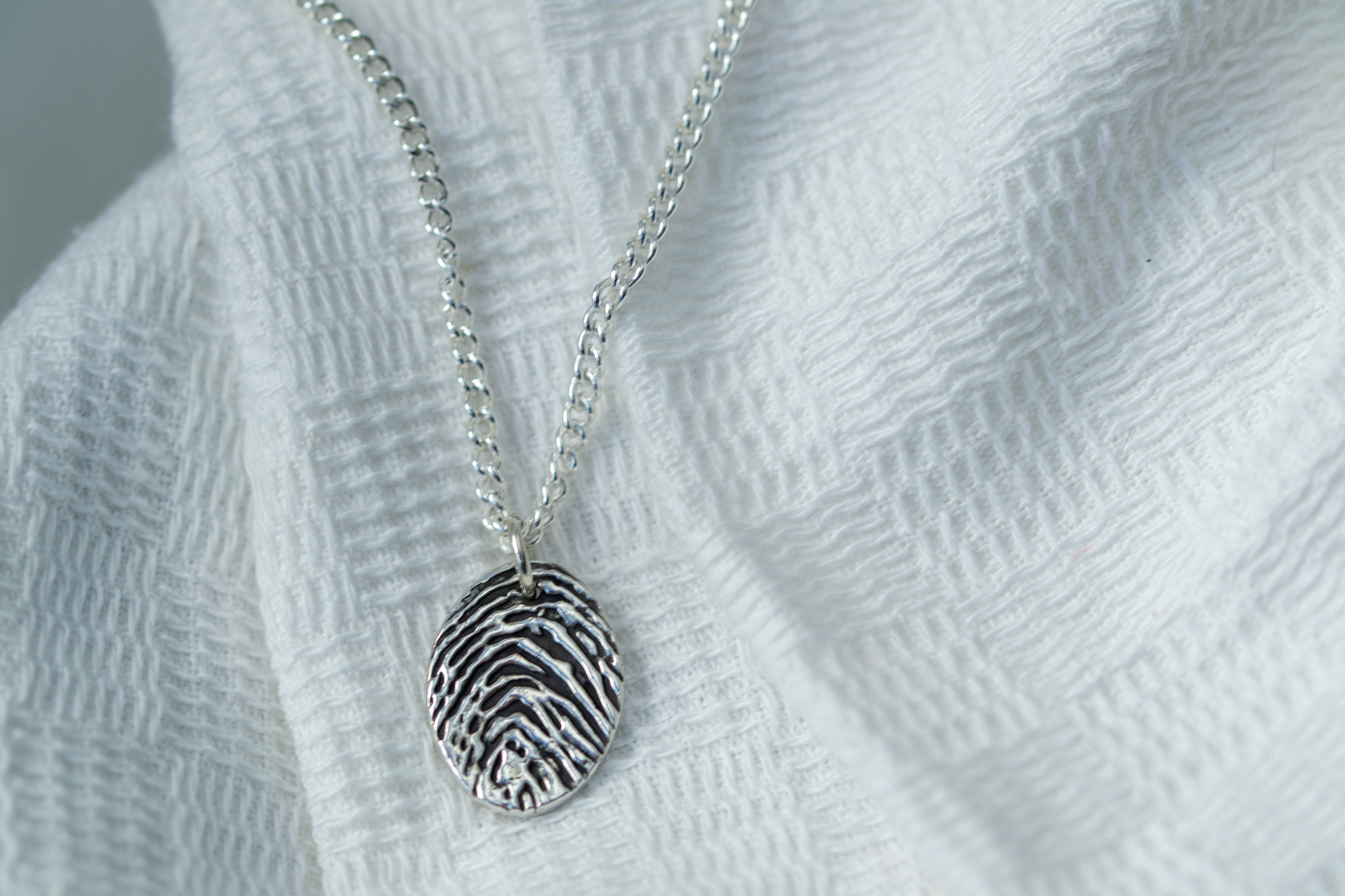 Prefer a longer, elegant chain to showcase your memorial fingerprint jewellery? This sterling silver pendant beautifully captures the texture of a loved one’s fingerprint, creating a meaningful keepsake. Upload an existing ink print with your order or choose an ink print kit to send it later. Select from various pendant shapes, each available for engraving with a name and age. Complete your piece with one of our Italian-made slinky sterling silver curb chains, available in two sizes.